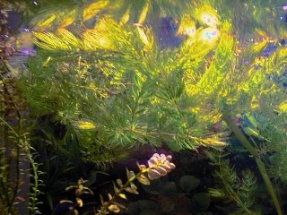 - Der CO2-Wert ist lausig (ca. 15 mg/l um 16:30), Licht ist nur halb so viel da, wie eigentlich sollte, CO2 ebenfalls, doch ich werde so ein halbes Jahr checken, ob ich um 2 weitere Lampen und eine CO2-Anlage herumkomme. Bin nach dem Umzug und der Renovierung sowieso blitzeblank. Die Bacopa wirkt wie eine zu grün geratene Rotala macranda, mit der ich eigentlich nur Pech habe: Sie wurzelt äußerst zögerlich, die Fische spielen mit den schönen großen Blättern, rupfen die Pflanze aus und knabbern sie an. Die damaligen Macrandas verschwanden in ca. 15 Helleri-Bäuchen. Auch die Bacopas haben etliche Bißspuren. Wahrscheinlich sind sie genauso lecker. Das Papageienblatt (vermeintliche Ludwigie) ist jetzt klar als solches zu erkennen, die neuen Blätter sind bronzerot. Im Interesse der Rotala habe ich 2/3 des Hornkrautes entfernt. Dabei kam mir die Erkentnis, warum die neuen Triebe weich und seidig sind: das Gestrüpp war direkt unter die Leuchten gewachsen, und da war es recht warm, anders als bei den Leuchtstoffröhren. Die Fische sind sauer, daß ihr grünes Verhau weg ist, also gibt's eine Prise Flockenfutter als Friedensangebot, was auch von allen Insassen angenommen wird. Wußte doch, daß die Viecher bestechlich sind! Der Platzhirsch windet sich und "hustet" wie jemand, der eine Fischgräte verschluckt hat. Mir wird angst und bange, da würgt er eine Faser Hornkraut aus. Eins der jungen Weibchen wird vom Ollen heftig gejagt, jetzt, wo mehr Licht ist, sehe ich, warum: da ist kein Trächtigkeitsfleck, die Schwanzflosse sieht verdächtig spitz aus und hat unten einen feinen, schwarzen Streifen, die hintere Bauchflosse beginnt, sich zu verdicken... - oh nein, noch ein Männchen! - Also Korrektur: der Olle hat alle Weiber, alle anderen Männchen ab ins Hornkraut und in den Wasserfreund! - Das Hornkraut soll jetzt die Wasserchemie eines 3500l großen, versifften Gartenteichs retten, wie es das schon mal vor 10 Jahren getan hat. Da war der Teich aber noch nicht sooo versifft. Ich hatte damals schon den Leuten geraten, Wasserpflanzen nicht zu entfernen, Aber man konnte ja die Fische nicht sehen... Im nächsten Jahr kam Wasserpest, Krebsscheren und Hornkraut aus dem Teich, (damit die Seerose Platz hat), im übernächsten gab's dann wieder Algenpest und Reiherfutter. - Unnötig zu sagen, wie mir das Herz geblutet hat! 27.04.00 Habe gerade das älteste Weibchen erwischt, wie sie ein abgebissenes, danach über Nacht eingeweichtes Bacopablatt (hellgrüne Sorte, an die neuen, rot angehauchten Blätter kommen sie noch nicht so gut ran) vollständig und mit bestem Appetit verspeiste. Sie zog es dem Flockenfutter eindeutig vor. Na, mal sehen, wie lange sich die Pflanzen halten und ob sie den Macranda-Rekord von 6 Woche brechen. Eine Woche haben sie schon hinter sich. Das Aquarium ist schwach veralgt, die Algen sitzen im Boden, auf den Steinen und der hinteren Wand. Die 1 -2cm starke obere Bodenschicht zeigt mir, wie schwer Algenbekämpfung ist: sie produzieren erheblich früher Sauerstoff als die Pflanzen, und das, obwohl sie nur wenig Licht bekommen. Auch die in der Schattenregion auf den Steinen fangen früh zu "blubbern" an. Wenn's zu schlimm wird, gibt's 'ne Mittagspause, das können die Pflanzen scheinbar besser vertragen als die Algen, wie mir das Becken am Starenweg gezeigt hat. Hygrophila, Rotala, Alternanthera und Cabomba habe reichlich Wurzeln gebildet, die im Wasser driften. Seit die Hygrophila die Amazonas anschattet, ist sie nicht mehr ganz so wuchsfreudig, diese Woche gab es nur 1 neues Blatt. Dafür hat sich die vordere entschlossen, mal etwas mehr Grün zu produzieren. Alle Vallisnerien haben Ausläufer gebildet, und ich beglückwünsche mich, daß es nicht mehr die Giganthea, sondern die zierliche Natans ist. 28.04.00