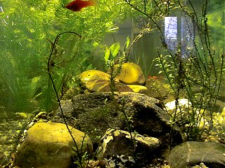 Die Altblätter der Amazonaspflanzen sehen rostig aus, das Zeug ist auch nicht abzuwischen (kein Mulm!), muß in den Blättern sein. Beim Zusammensetzen der Bildergalerie ist mir aufgefallen, daß in meinem Aquarium so gut wie kein Blau vorkommt, obwohl es im Lampenspektrum gut vertreten ist. Ein ausgerupftes Vallisnerienblatt auf dem Boden ist rot geworden (Anthocyan): nun weiß ich, daß mein Licht doch ausreicht. Das Aquarium macht heute morgen einen leicht trüben Eindruck, der aber nach Reinigung der Frontscheibe mit Filterwatte verschwindet. Was dabei auch verschwindet, sind die Schwertträger, und zwar in die Büsche. Als das Wasser sich beruhigt hat, kommen sie wieder hervor. 29.04.00
